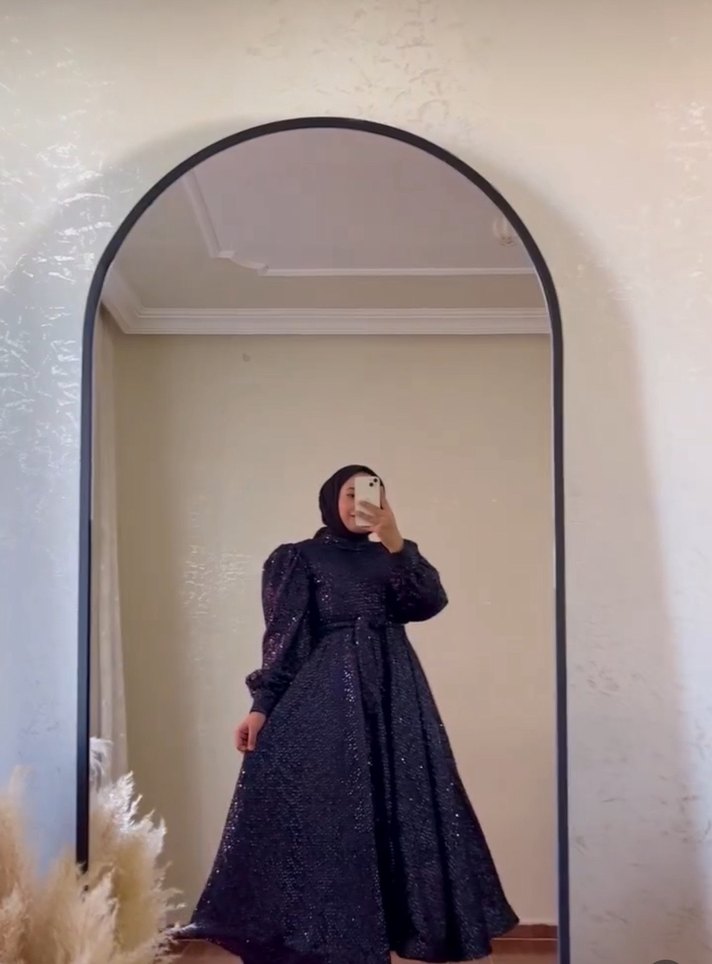 Siyah uzun kollu, yüksek yakalı, bol kesim gotik tarzda drapeli desenli uzun abiye elbise. Düğün gibi özel günlere uygun.