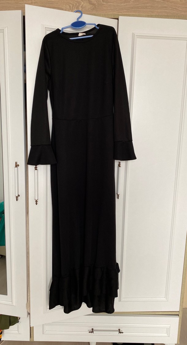 Siyah, uzun kollu ve drapeli manşetlere sahip bu dar kesim uzun elbise, yumuşak sentetik kumaştan üretilmiştir. Modest ofis giyimine uygun gotik tarzda.