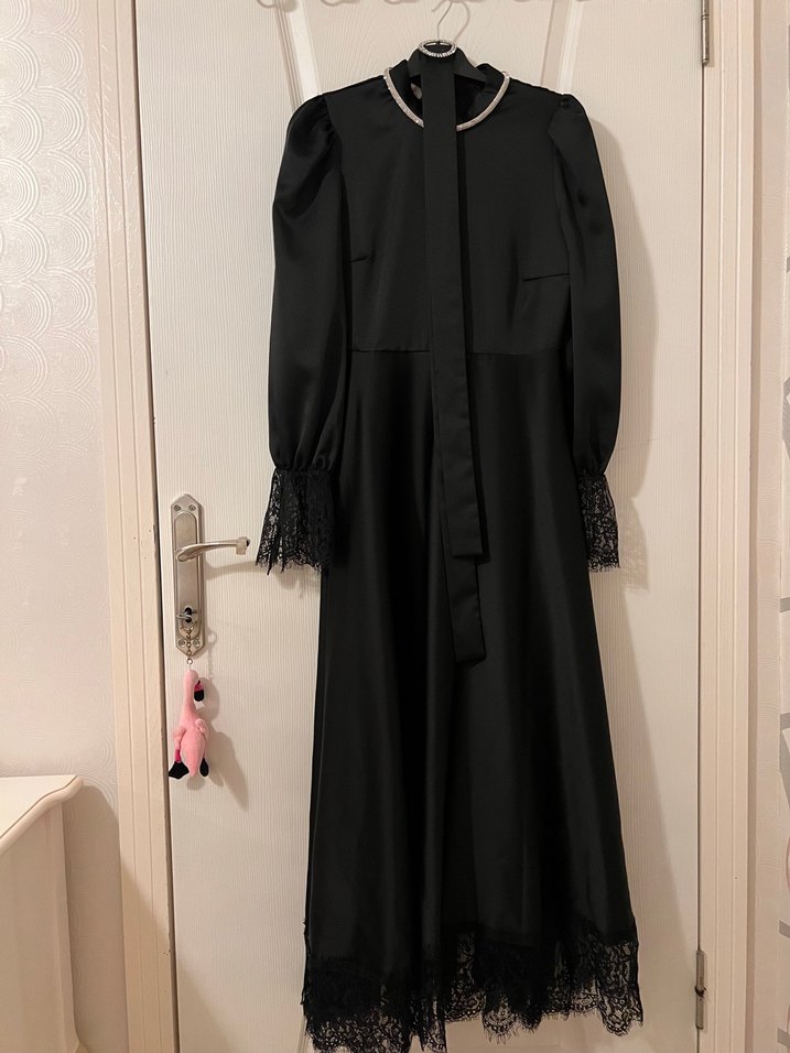 Siyah uzun kollu, yüksek yakalı, dantel detaylı ve dökümlü kesime sahip, saten kumaştan yapılmış klasik gotik tarzda uzun elbise.