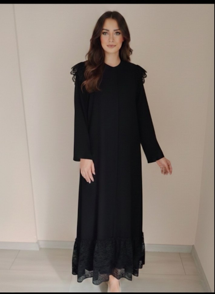 Siyah uzun kollu, yüksek yakalı ve bol kesim elbise. Drapeli detaylara sahip, sentetik kumaştan üretilmiş, günlük kullanıma uygun modest gotik tarzda.özel dikim