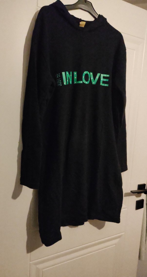 Siyah uzun kollu hamile tişörtü, bol kesim ve bisiklet yaka ile. "INLOVE" baskılı, yırtmaç detaylı, yumuşak ve sıcak kumaştan, günlük kullanım için uygun.