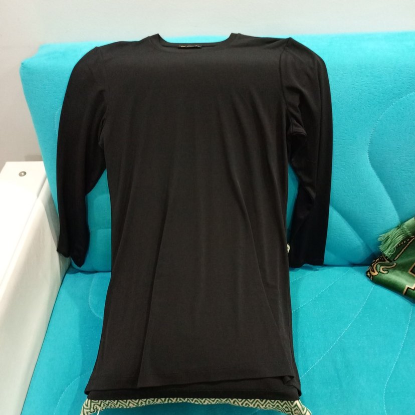 Dar kesim siyah hamile tişörtü, yuvarlak yaka ve uzun kolludur. Normal midi boyu ve düz koyu renk sentetik kumaşıyla rahat sokak stili için uygundur.