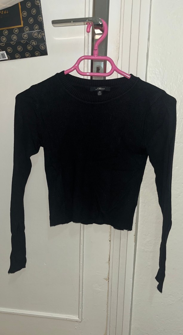 Dar kesim siyah kazak, uzun kollu ve yuvarlak yakalıdır. Yumuşak sentetik kumaştan yapılmıştır ve günlük kullanım için minimalist tarzda desensizdir. deforme yoktur tam kalıp