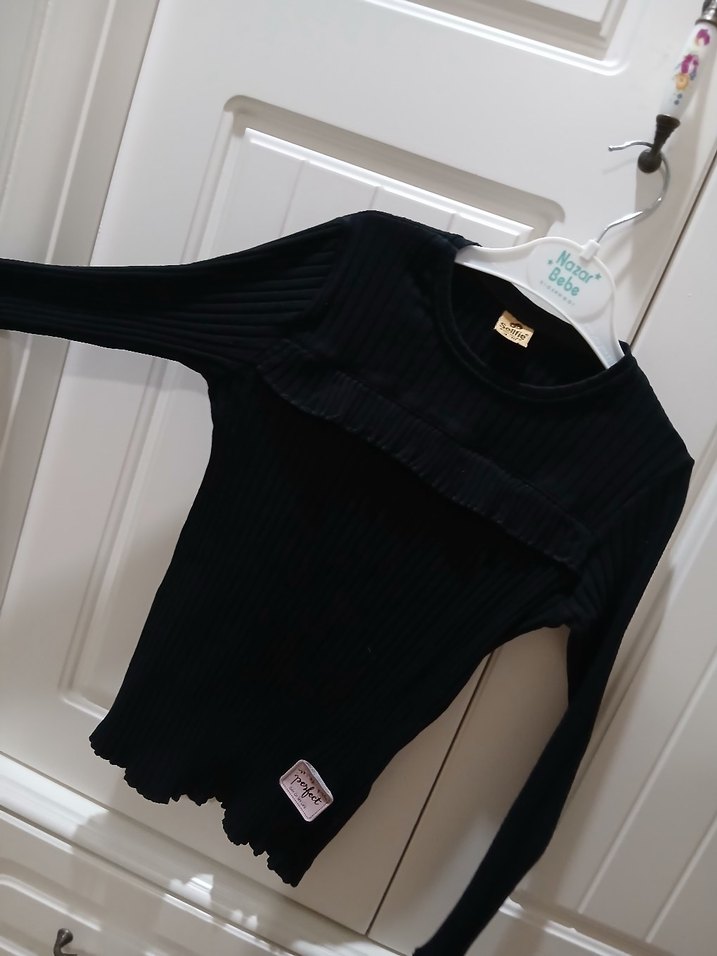 Siyah renkli, uzun kollu, ince triko kumaştan yapılmış, vücuda oturan, normal midi boyda çocuk kazak. Düz ve desensiz tasarımıyla günlük kullanıma uygundur.