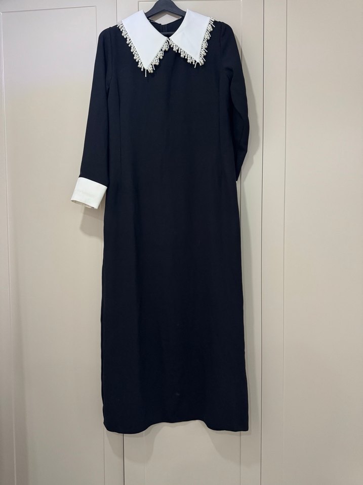 Siyah uzun kollu inci detaylı elbise belden oturtmanı sırtı fermuarlı bir kere giyildi