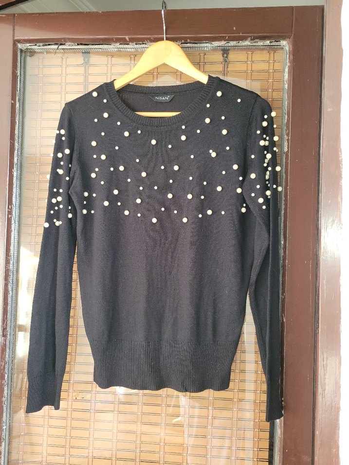 Siyah, uzun kollu, incili detaylı triko kazak. Yuvarlak yaka ve normal kesim ile günlük kullanıma uygun, rahat ve şık bir parça.