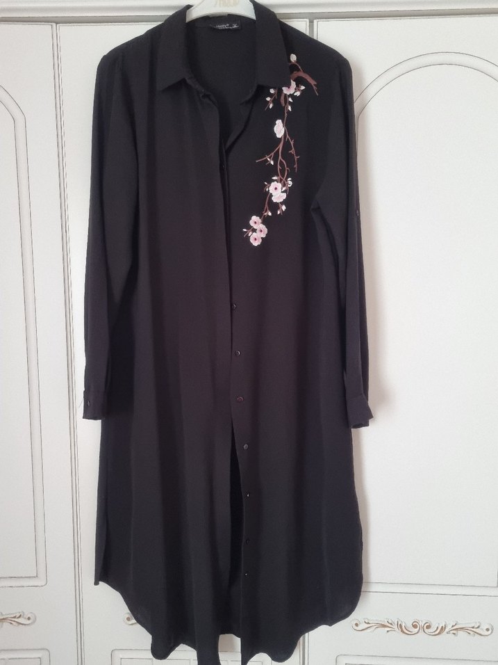 Siyah, uzun kollu, düğmeli ve nakış detaylı, notched lapel yakalı, salaş kesim, ofis için uygun ipeksi kumaştan tunik.