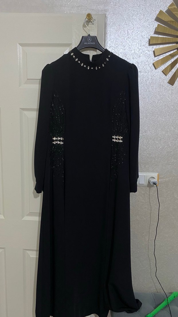 Siyah uzun kollu elbise, işlemeli ve payet detaylarıyla abiye bir kere giyildi hiç bir kusuru defosu yoktur