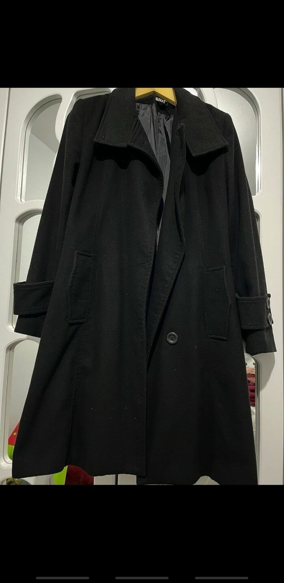 Geniş yakalı, düğmeli manşet detaylı siyah uzun kollu kaban. Önünde iki cep ve iç kısmında yumuşak astar bulunur.