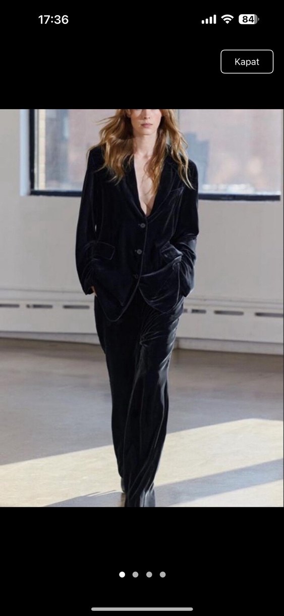 Siyah, uzun kollu kadın blazer ceket, ve yakasında kesikli yaka bulunur. Kadife kumaştan üretilmiş, ofis için uygun, zahmetsiz şıklık sunar. Üst l beden oversize olsun diye alt s