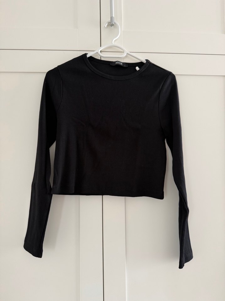 Siyah, uzun kollu, dar kesim, yuvarlak yaka bluz. Pürüzsüz sentetik kumaştan, minimal ve sokak stili şıklığı sunar. ✨