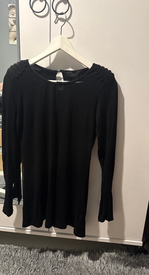 Siyah, triko dokulu omuz detaylı, uzun kollu, bisiklet yaka ve normal boyda, ince kesim kadın bluz.