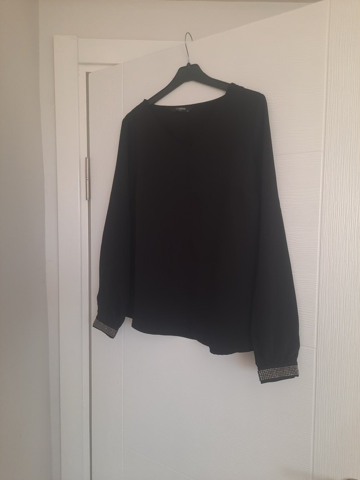 Siyah renkte, bisiklet yaka ve uzun kollu, bilekte detaylı manşetleri olan kadın bluz. Yumuşak ve sıcak kumaştan, günlük sokak stiline uygun rahat bir parça.