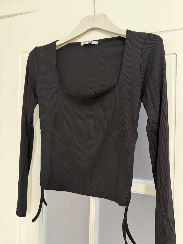 Siyah, uzun kollu, vücuda oturan kesim ve yuvarlak yakalı kadın bluz. Yumuşak sentetik kumaştan, baskılı detaylı, minimalist sokak stili için uygun. Günlük kullanıma ideal.