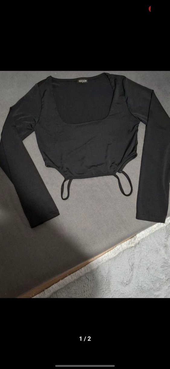 Siyah, uzun kollu, tek renk ve sentetik kumaştan yapılmış, oturan kesimli kadın bluz. Günlük kullanıma uygun, şık ve goth tarzında crop. L bedendir. Dekolteli.