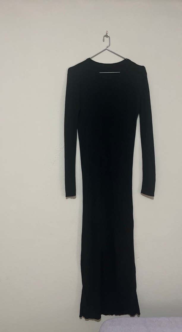Düz siyah, uzun kollu ve bisiklet yaka, vücuda oturan uzun elbise. Pürüzsüz sentetik kumaştan, minimal ve şık tasarım günlük kullanım için uygundur.