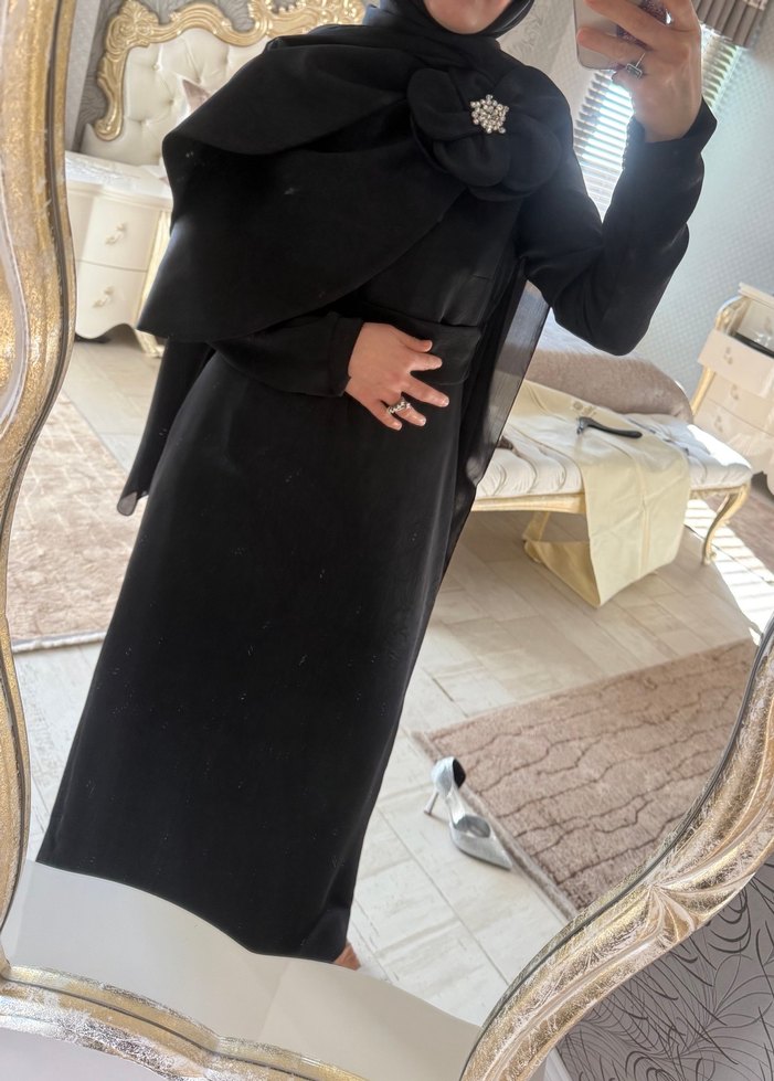 Uzun siyah kadın elbise, regular kesim ve uzun kollu, tarz sade koyu renkte. Hiç giyilmedi .