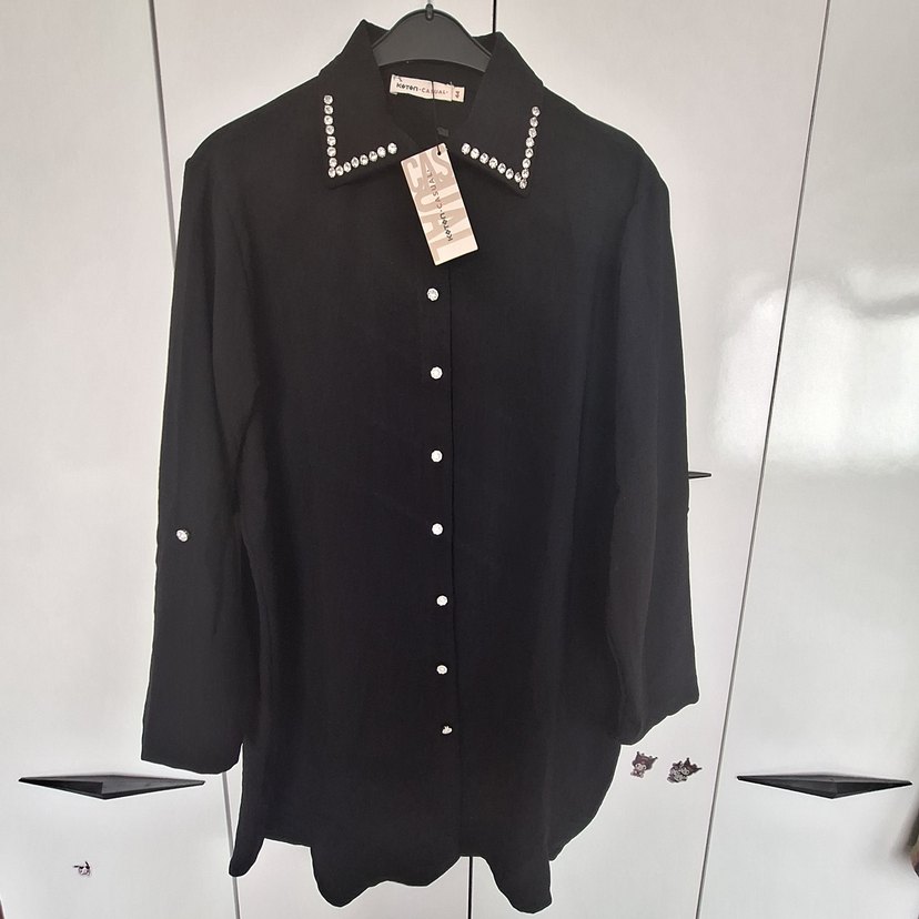 hic kullanılmamış etiketli gömlek tunik.rengi cok canli siyah.fotograflarda tam anlaşılmamış.takim halinde ama pantolonunu 2-3 defa kullandım.su an sadece gömlek satışta. pantolonunu da isterseniz fiyata ekleyerek onu da gönderebilirim.kol altından eni 56 cm baseni de 56 cm boyu 86 cm.sayfamda ayni takimin kiremit rengi de mevcut. inceleyebilirsiniz.#Kadın gömlek#kadintunik#siyahtunik#şıkgomlek#kadin