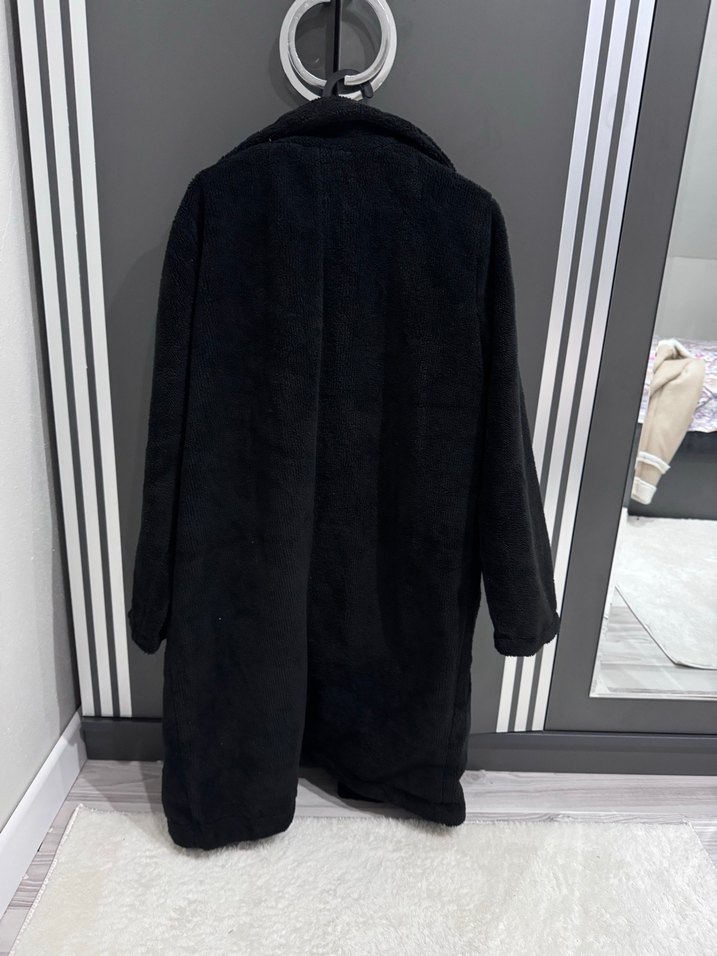 Siyah uzun kollu kaban, kürklü detaylı ve yumuşak, sıcak dokusuyla rahat bir kullanım sunar. Günlük sokak stili için uygundur. s M uyumlu