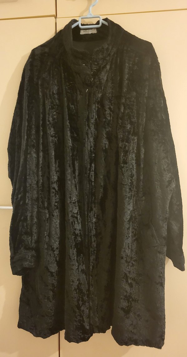 Siyah renkte, uzun kollu ve bol kesim gotik tarzda kadın kaban ceket Yumuşak dokulu kumaşıyla koyu ve desensiz bir görünüm sunar.