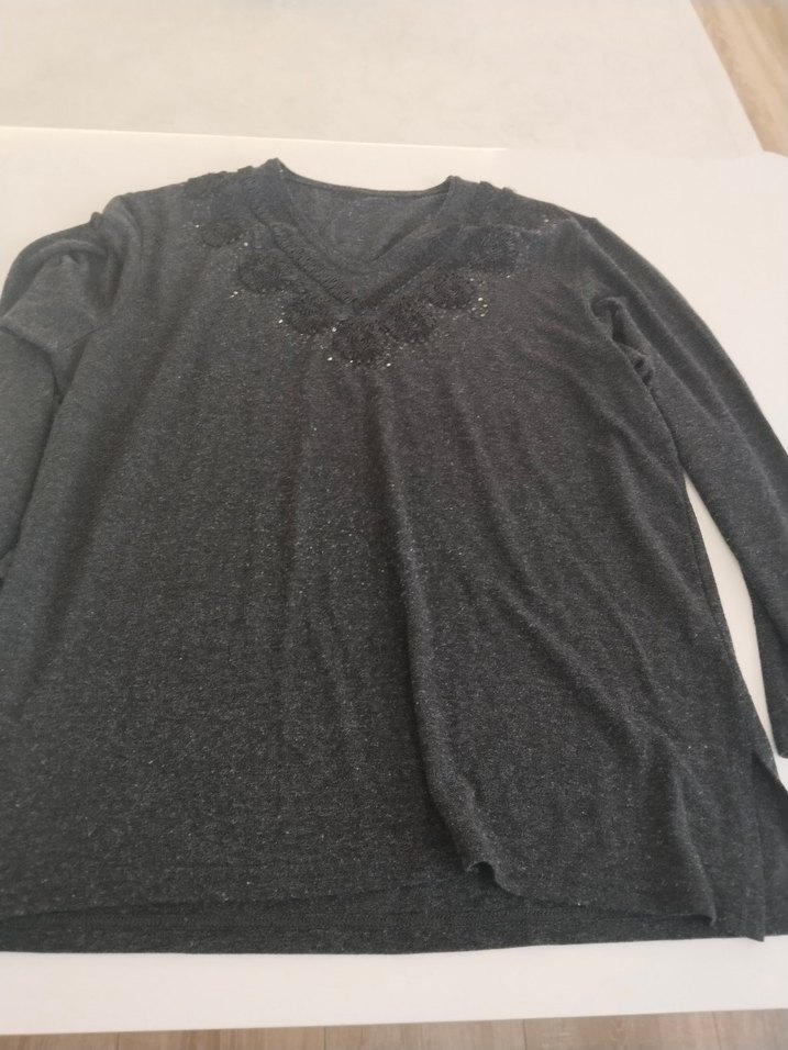 Gri V yaka, uzun kollu ve payet detaylı, rahat kesim kadın triko. Yumuşak keten kumaştan, günlük kullanıma uygun. #kadin#giyim#siyah#annekazagi#L#beden#