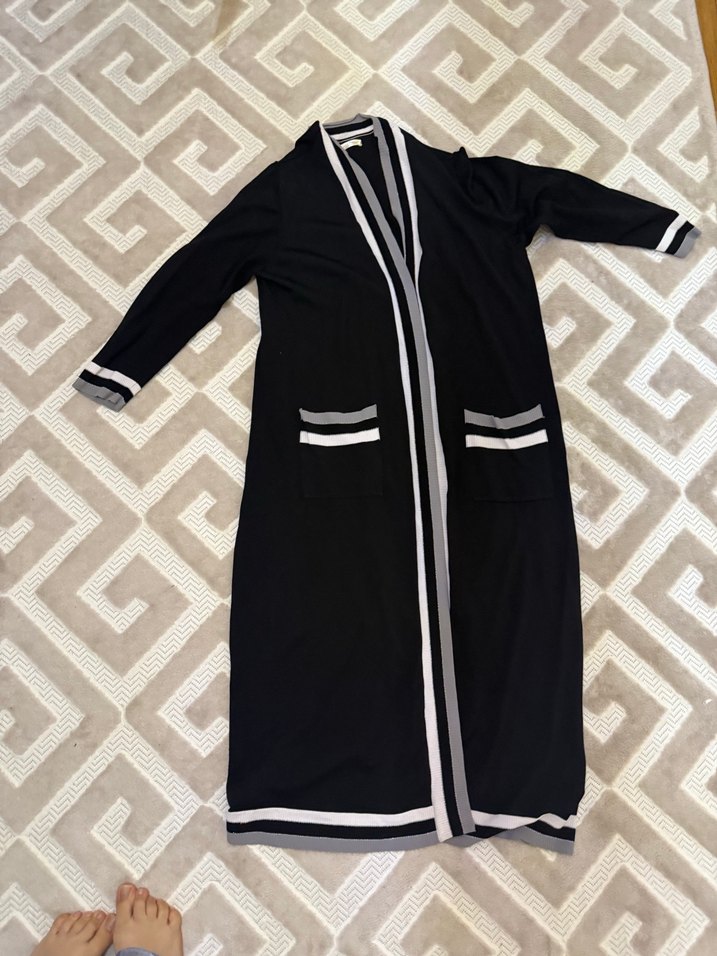 Siyah uzun kollu kadın hırka, beyaz şerit detaylı, regular fit ve uzun boy, spor ve sokak stili için uygundur.