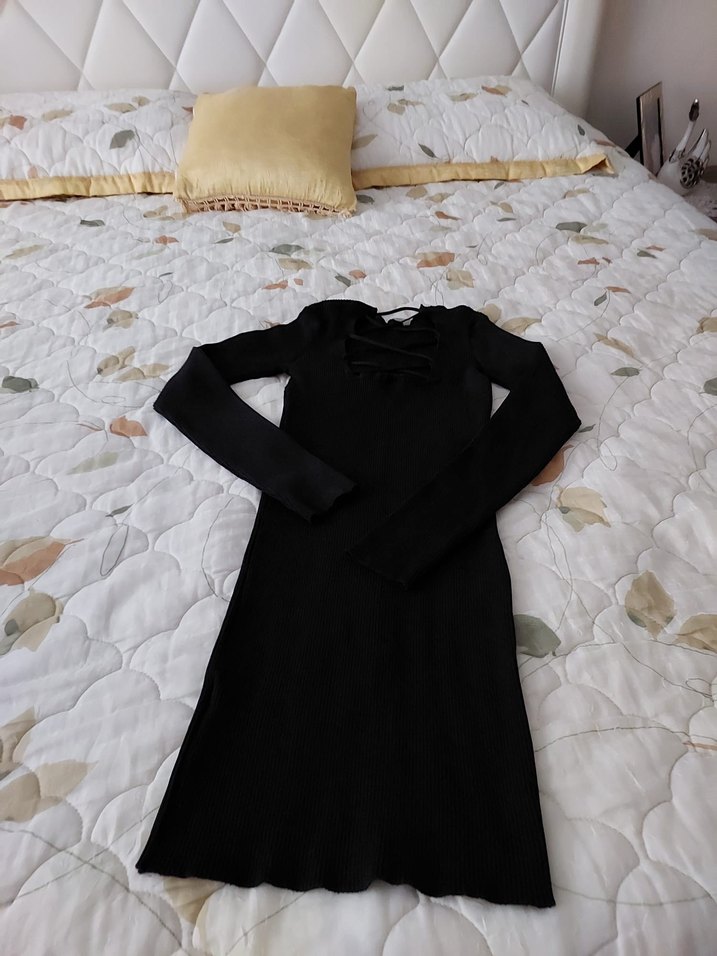 Uzun kollu, v yaka ve kürk detaylı siyah triko elbise, yumuşak sentetik kumaştan üretilmiş, günlük kullanım için uygundur.