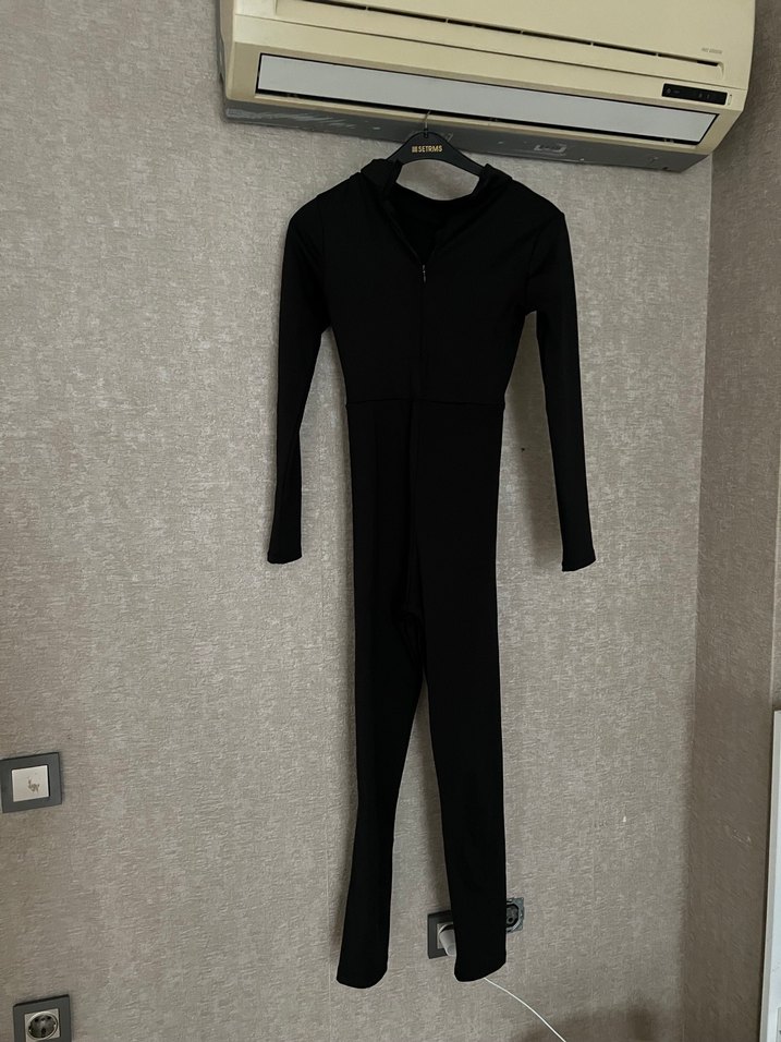 Siyah, uzun kollu ve yüksek yakalı bu dar kesim tulum, yumuşak sentetik kumaştan yapılmıştır. Günlük kullanım için zahmetsiz şıklık sunar.