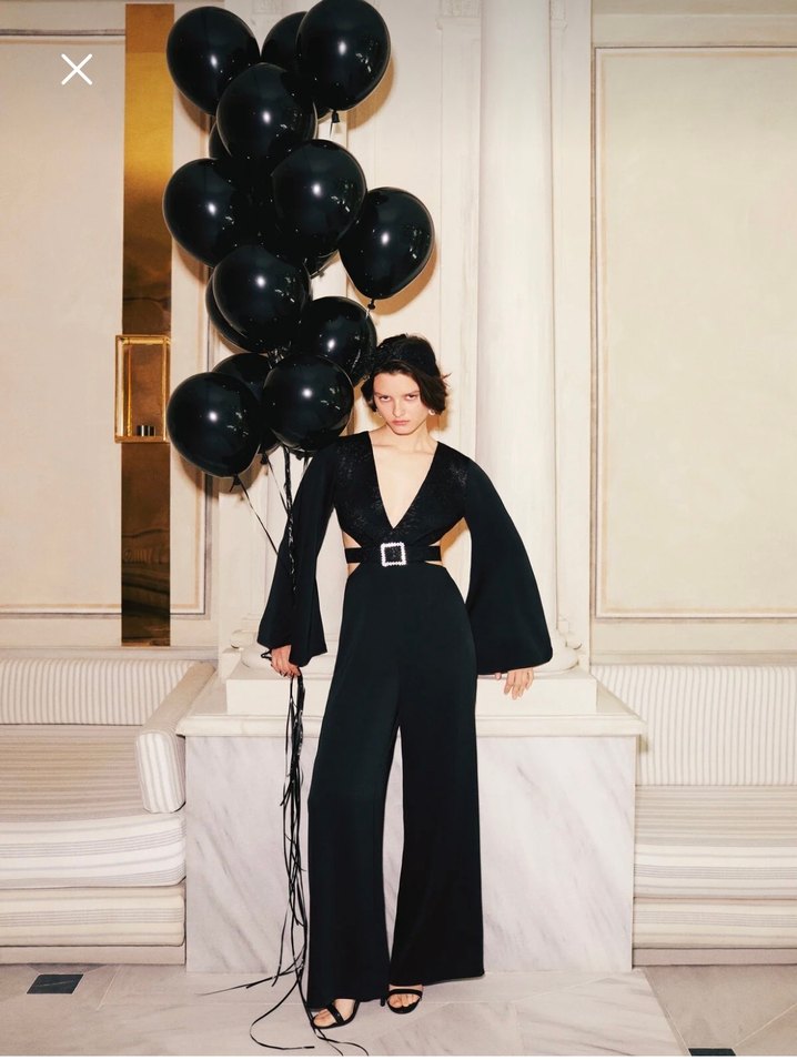 Siyah, v yaka, geniş uzun kollu ve kare tokalı kemer detaylı, vücuda oturan tulum. Pürüzsüz kumaştan, adil ışık tulum