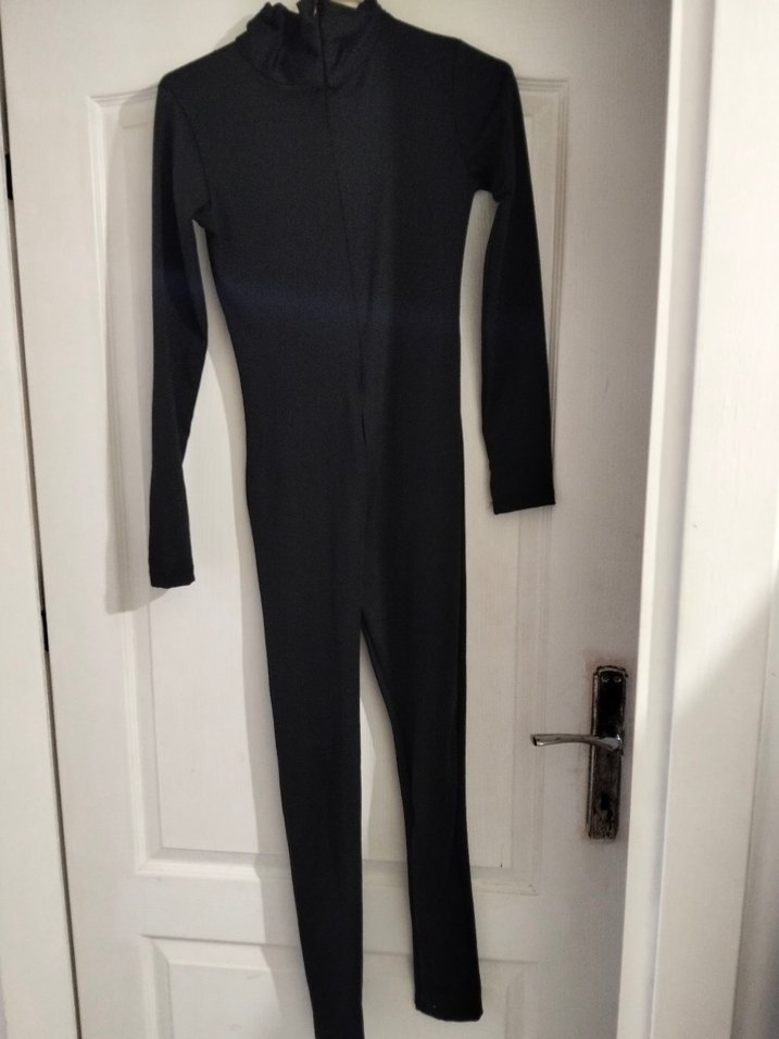Uzun kollu, yüksek yakalı siyah tulum, sentetik kumaştan ve vücuda oturan kesimde. Uzun boyu ve şık tasarımıyla günlük kullanıma uygun avant-garde tarz sunar. sadece ufacik bir sokuk var ,ufak bir dikisle hallolur.resimde belli,ligrali