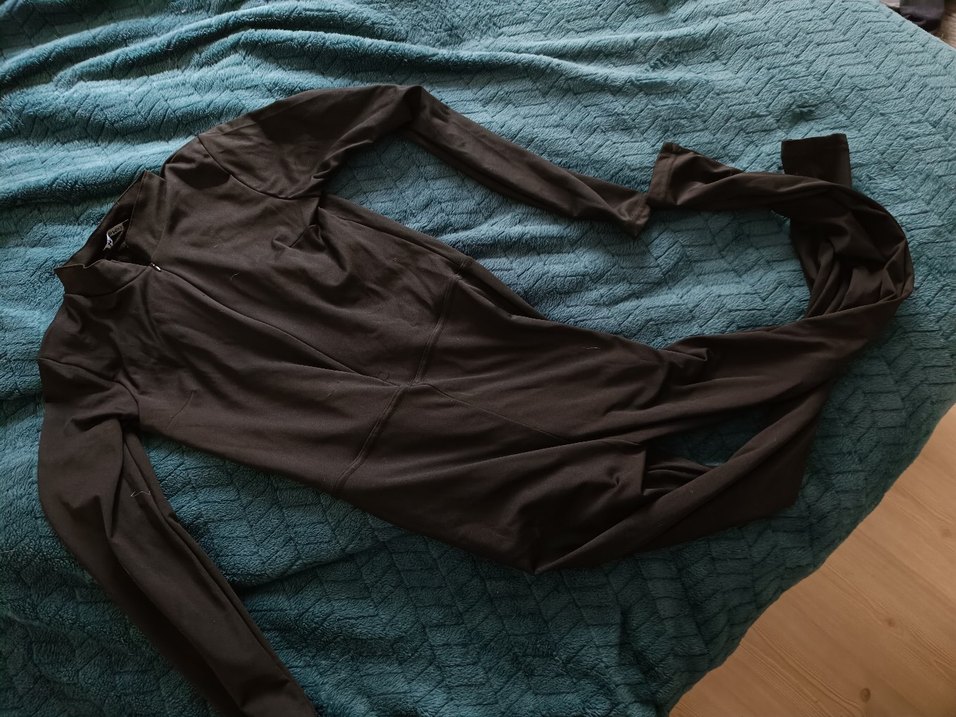 siyah, uzun kollu ve içi polarlı, dökümlü tasarıma sahip dar kesim kadın tulum. Yumuşak sentetik kumaştan üretilmiştir.