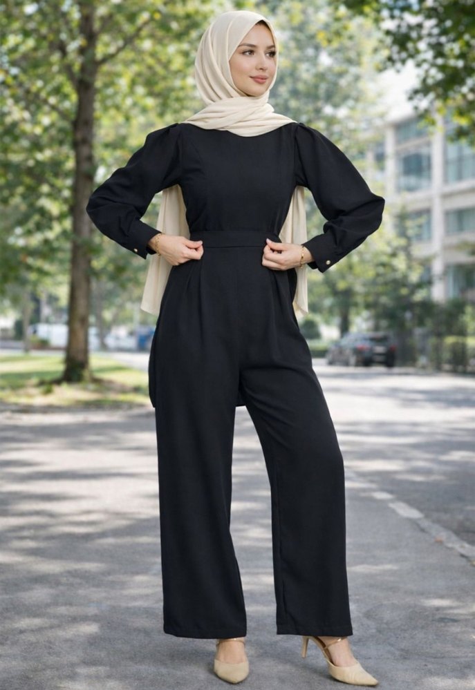 Siyah renkli, uzun kollu ve yuvarlak yakalı kadın tulumu, sentezik kumaştan üretilmiş ve günlük sokak stili için rahat bir kesime sahiptir.