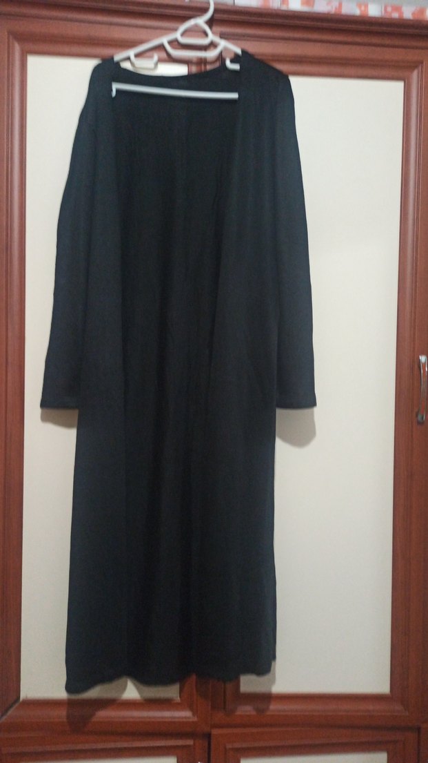 Siyah, uzun kollu ve bol kesim kadın uzun boy hırka. Minimalist goth tarzında, desensiz ve koyu renkte.