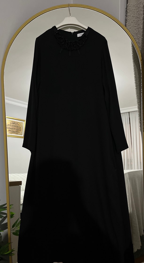 Bu siyah uzun elbise, uzun kollu ve yuvarlak yaka detayına sahip, dökümlü tasarımıyla dikkat çeker. İpek gibi kumaştan üretilmiş, klasik zarafeti yansıtan minimalist gotik stilde, ofis için uygundur. Temizdir bir problemi yoktur kemer olmadığı için bu fiyattadır çok da güzel yani