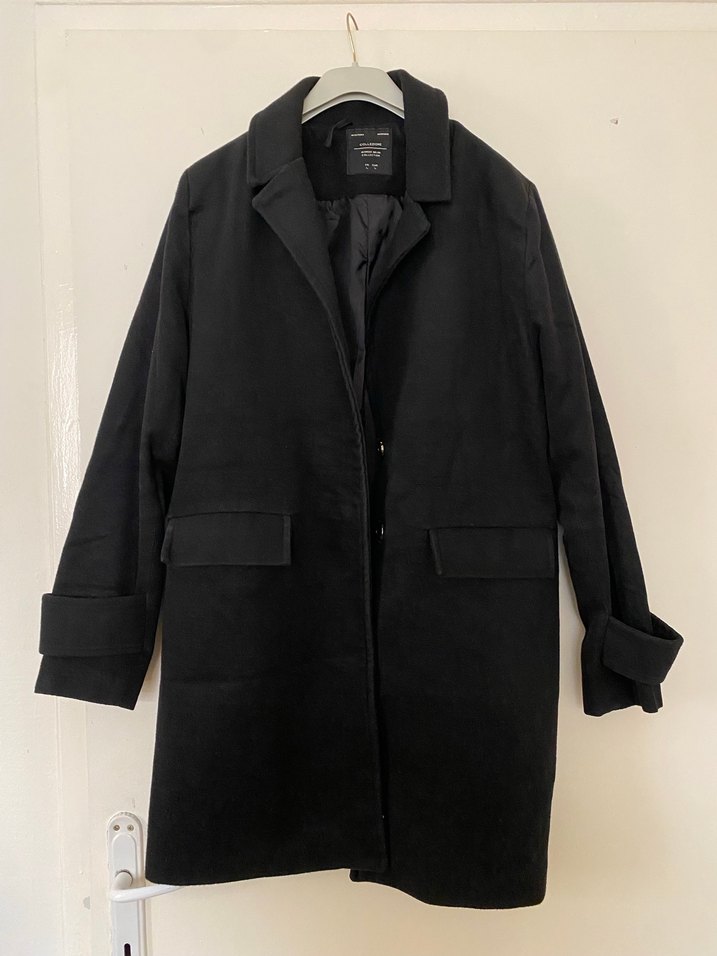 Klasik yakalı, ön cepli siyah uzun kollu kaban. Düğmeli kapama ve sade, şık tasarıma sahip.