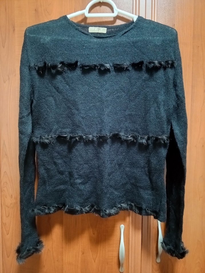 Siyah uzun kollu ve yuvarlak yakalıdır. Önünde kol uçlarında ve etek ucunda kürk detayları vardır. Siyah moherdir ışıktan gri gibi görünmüş. Fotolarda belirtildiği gibi bir kaç ufak ilmek kaçması vardır. 1/S bedendir