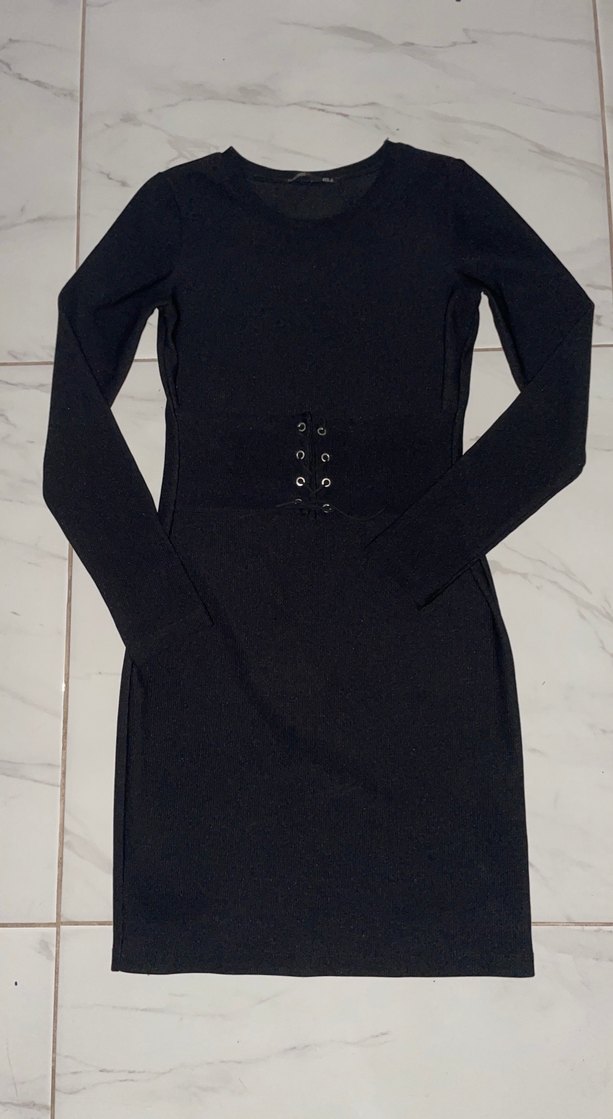 Siyah, uzun kollu, kemerli ve dar kesim triko elbise, yumuşak sentetik kumaştan, gotik tarzda.