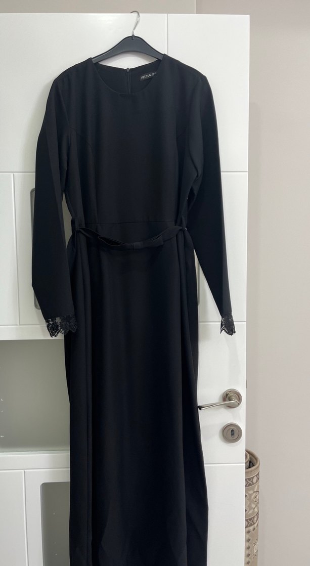 Siyah uzun kollu, dantel detaylı manşetlere sahip, yüksek yakalı ve kemerli belden oturan gotik tarzda uzun elbise. Ofis için uygun, sade ve şık bir tasarım.