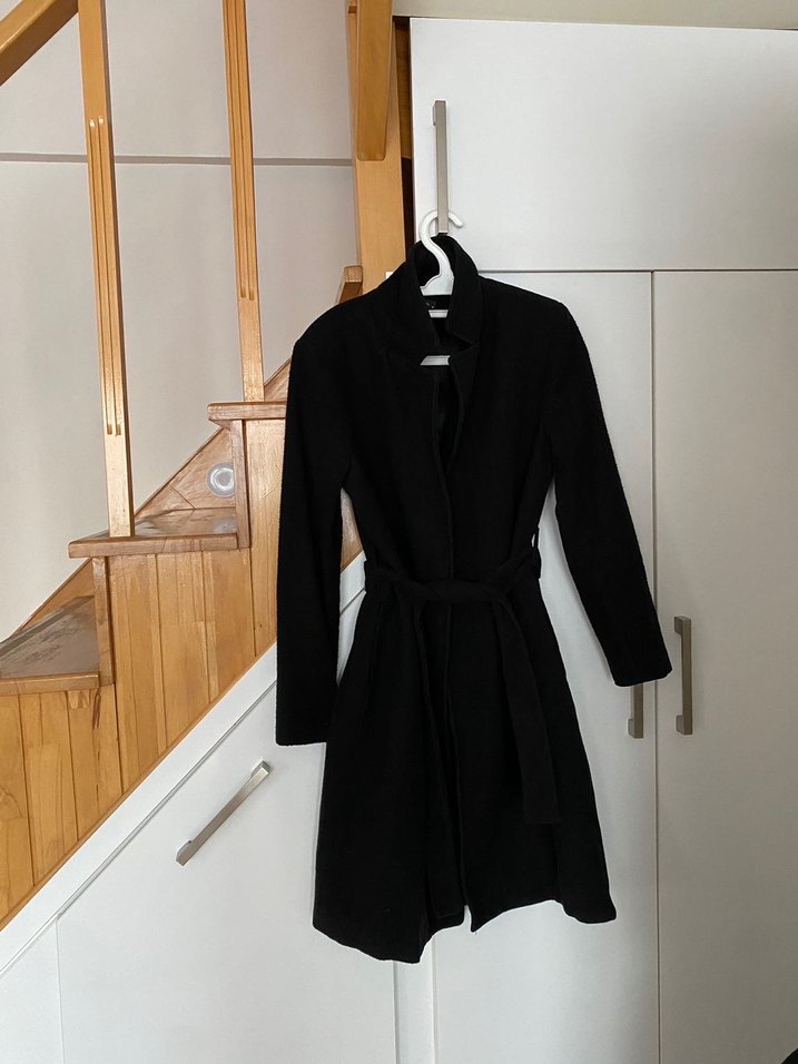 Bu siyah kaban uzun kollu ve belde kemerli olup, şık ve sade bir tasarıma sahiptir. Klasik yaka detayına sahiptir.