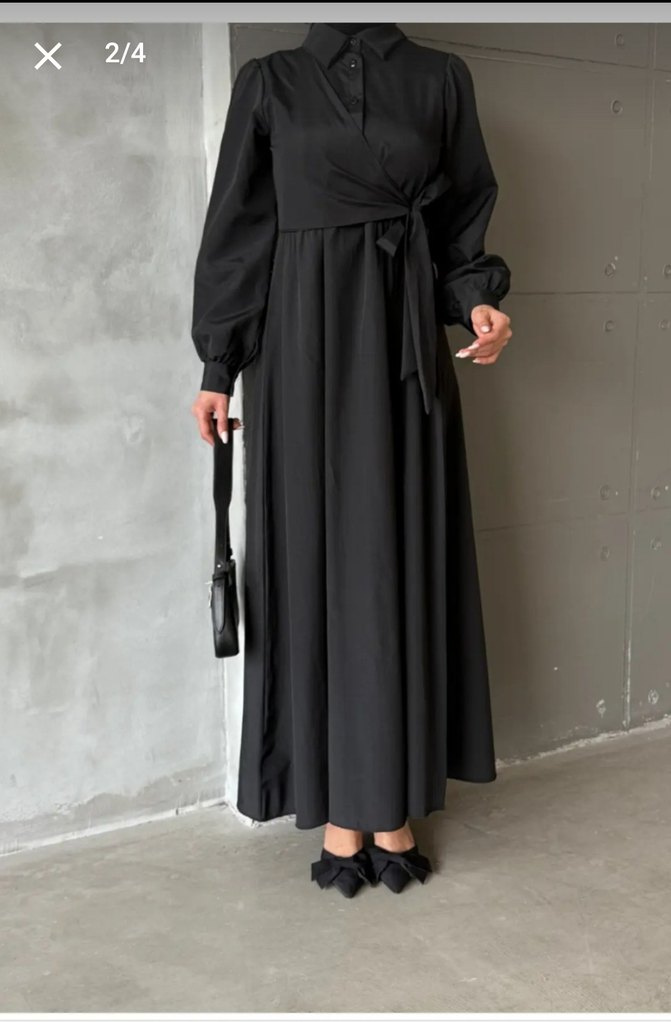 Siyah uzun elbise, yüksek yakalı bol kesimdir. Uzun kollu, minimalist tasarıma sahiptir ve günlük kullanıma uygundur. Pürüzsüz sentetik kumaştan yapılmıştır.