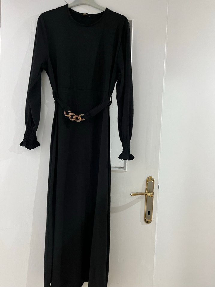 Siyah uzun kollu, uzun elbise, beli kemer ile vurgulanmıştır. Düz, sentetik kumaştan, rahat kesimlidir. Günlük kullanıma uygundur tertemiz be yeni gibidir solma yoktur
