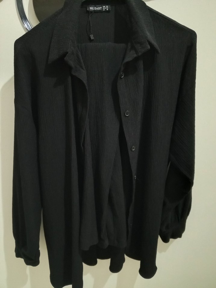 Siyah renkte, keten kumaştan, uzun kollu ve yaka detaylı, düğmeli önü olan, bol kesim minimalist ve avant-garde tarzı gömlek ve pantolon takım.