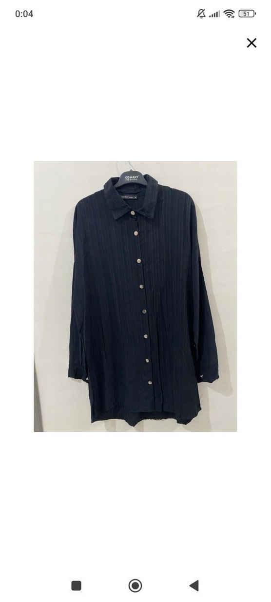 Siyah keten gömlek, uzun kollu ve düğmeli. Yaka tipi klasik ve bol kesimdir. Minimalist, uzun boylu ve desen içermez.