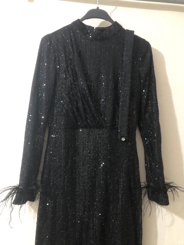 Dar kesim siyah abiye elbise, uzun kollu ve yüksek yakalıdır. Manşetlerde kürk detayları bulunur ve hafif ışıltılı görünümüyle dikkat çeker. ✨