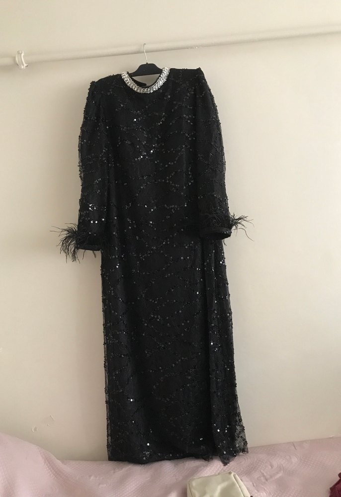Siyah uzun kollu abiye elbise, yüksek yakalı ve kollarında kürk detaylıdır. Gevşek kesimi ve gösterişli gotik tarzıyla partiler için uygundur. ✨