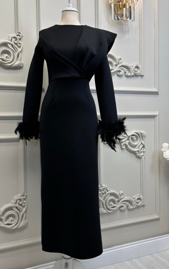 Siyah uzun kollu gece elbisesi, V yakalı ve kollarında kürk detayları bulunur. Düzenli kesim, avangart gotik tarzda, ofis için uygun. K*r*l*k şal dahil