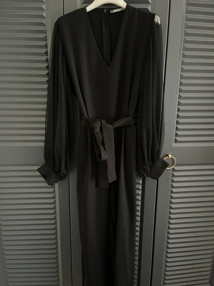 M beden. 1 kez giyildi. Kolları tül, V yaka, siyah, beli kuşaklı, cepli tulum. Boyun kısmı fermuarlı. Şık bir ürün