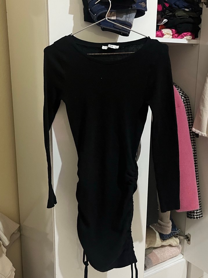 Siyah uzun kollu midi elbise, dar kesim ve bisiklet yaka. Pürüzsüz sentetik kumaştan, minimal ve sokak tarzı şıklığı sunar. Günlük kullanım için rahat ve şık. S bedendir