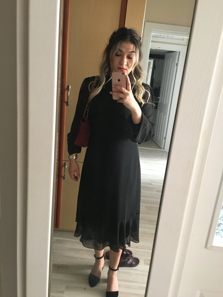 Siyah midi elbise, yüksek yakalı ve uzun kollu, ipeksi kumaştan, rahat kesimle şık bir görünüm sunar. Ofis için uygun, gotik tarzda.