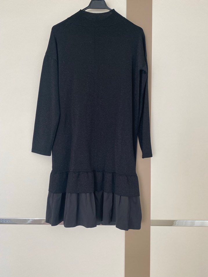 Siyah, uzun kollu ve yüksek yakalı midi elbise, bol kesimdir. Etek kısmında volan detayları vardır. Yumuşak sentetik kumaştan yapılmıştır, günlük kullanıma uygundur. Beymen club Xs beden ancak S ve m beden için uygundur rahat kesimdir